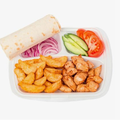 Поджаренная пита, 3 вида соусов ( чесночный, томатный и горчица), томаты, курица, картофель фри